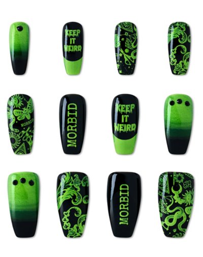 Get the best manicure of your life in an instant with these press-on nails inspired by Morbid podcast co-host Alaina! Featuring bright green prints on black nails, these press-ons celebrate keepin' it weird. Officially licensed Includes: 24 press-on nails Material: Plastic, adhesive Imported.
