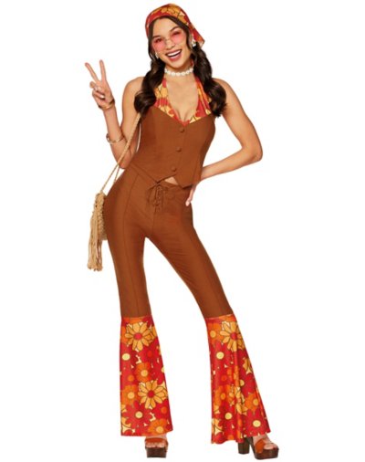 Don't worry, be HIPPIE! This adorable two-piece costume set is a thing of '60s dreams. Rock your flowers with power in thisAdult Flower Power 60s Costume, featuring bell bottom pants, a halter top, and daisy-printed head scarf! Includes: Top Pants Head scarf Halter top Material: Polyester, spandex Tie closure Care: Spot clean Imported.