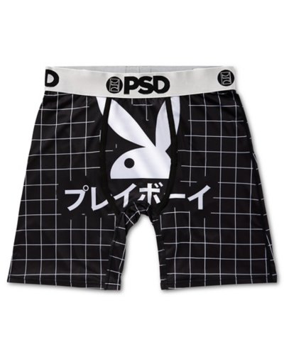 Take your boxer game to the next level with these exclusive, officially licensed Playboy Kanji Boxers, designed by PSD! Suit up in these stylish black and white boxers and you'll always be dressed to impress. Officially licensed Exclusively at Spencer's Material: Polyester, spandex Care: Machine wash Imported.