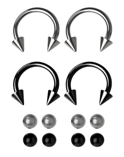 Includes: 2 Pairs of horseshoe rings 4 Sets of extra balls Piercing Type: Multiple Barbell Material: 316L Surgical steel Gauge: 12 Gauge/2.0mm Threaded closure Jewelry Care: Clean with antibacterial soap and warm water Piercing Care: Clean with saline solution Imported Note: Do not use any harsh, alcohol-based chemicals as this may cause tarnishing Do not over-thread or apply excess pressure when adding/removing beads as breakage could occur Surgical steel may contain trace amounts of nickel.
