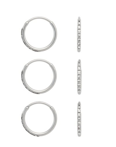 Includes: 3 Pairs of hoops Piercing type: Ear Material: 316L surgical steel Plating: Silver plated Gauge: Gauge / 0.8mm Stone Type: Crystal Stone Color: Clear Exterior Diameter: 12.4mm Interior Diameter: 10mm Clip closure Jewelry care: Clean with antibacterial soap and warm water Piercing care: Clean withH2Ocean Aftercare Spray(sold separately) or saline solution Imported Note: Do not use any harsh, alcohol-based chemicals as this may cause tarnishing Note: Do not over-thread or apply excess pressure when adding/removing beads as breakage could occur Wear in healed piercings only. If irritation occurs, remove immediately.