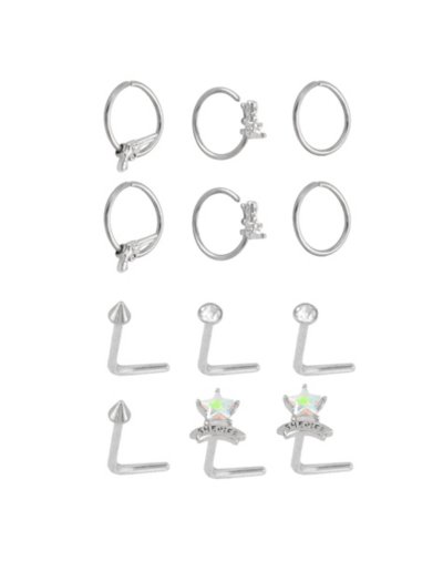 Includes: 6 Hoops 6 L-bend pins Piercing type: Nose Material: G23 Titanium Stone type: Cubic zirconia Stone color: Clear, aurora borealis Gauge: Gauge/0.8mm Length: 5/16"/8mm Hypo-allergenic Threadless closure Jewelry care: Clean with antibacterial soap and warm water Piercing care: Clean withH2Ocean Aftercare Spray(sold separately) or saline solution Imported Note: Do not use any harsh, alcohol-based chemicals as this may cause tarnishing Note: Do not over-thread or apply excess pressure when adding/removing beads as breakage could occur Wear in healed pier.