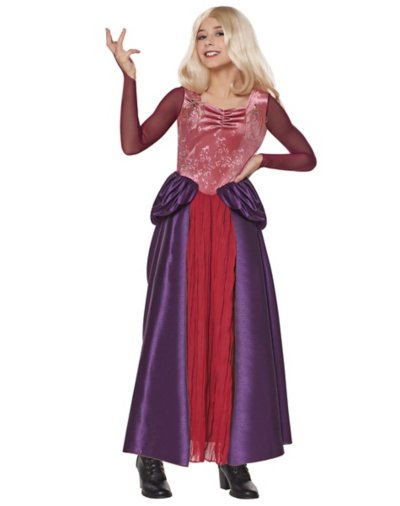 Sing a spellbinding song this Halloween as the fair and famous Sarah Sanderson! Join Winifred and Mary as you dance around in Sarah's signature dress, which features pink fabric at the top, while the skirt flows out into lovely red andlayers. The lace-up chest and bold red sleeves help complete the look in spellbinding fashion. Any Hocus Pocus fan will be dying to have this costume! Officially licensed Includes: Dress Long sleeves Tie closure Length: 48.4" from shoulder to hem Material: Polyester Care: Spot clean Imported Note: Shoes, wig, and cape sold separately.