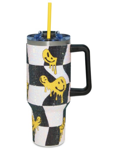 Sip in style with this rhinestone-studded tumbler, featuring melting smiley faces and a bold checker pattern for a fun, retro vibe. It's the perfect accessory to brighten your day (and your hydration game) with a little sparkle and a lot of personality. Exclusively at Spencer's Includes: Tumbler Lid Straw Dimensions: 13" H x 6" W x 4" D Capacity: oz. Material: Stainless steel Care: Hand wash Imported Arrives in box.