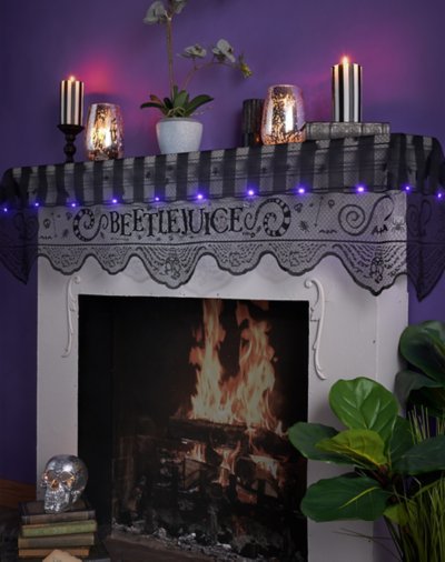 Set the creepy, crawly mood in your home with this officially licensed Beetlejuice mantel scarf! This sheer mantel scarf is adorned with Beetlejuice-themed designs including (of course) dozens of beetles. Simply lay this mantel scarf on a flat surface and have fun creating a spooky light-up display with your favorite decorations and candles. Officially licensed Battery Type: 3 AAA (not included) Dimensions: 20 H x 60 W Material: Polyester Care: Spot clean Imported.