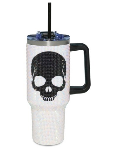 Buy White and Black Rhinestone Skull Travel Tumbler with Straw - oz for $34.99 at @ Spencersonline.com