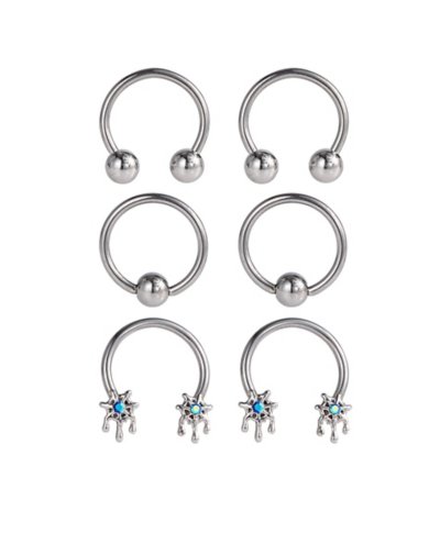 Includes: 6 Horseshoe rings Piercing type: Horseshoe Material: Stainless steel Gauge: Gauge / 1.2mm Threaded closure Jewelry care: Clean with antibacterial soap and warm water Piercing care: Clean withH2Ocean Aftercare Spray(sold separately) or saline solution Imported Note: Do not use any harsh, alcohol-based chemicals as this may cause tarnishing Note: Do not over-thread or apply excess pressure when adding/removing beads as breakage could occur Wear in healed piercings only. If irritation occurs, remove immediately This is a decorative item and should not be worn to sleep.