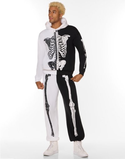 Have yourself the perfect skeleton outfit just in time for Halloween once you pick up these Black and White Skeleton Sweat Pants. These stylish two-tone sweatpants are a perfect option for staying comfortable and looking cool this Halloween season. Exclusively at Spencer's Elastic waistband Drawstring closure Material: Cotton Care: Machine wash Imported Note: Matching skeleton hoodie sold separately.