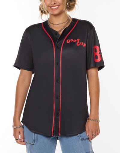 Wanna play ball? Show off your horror fandom by rocking this officially licensed Chucky Baseball Jersey and you'll always be looking cool. Featuring Chucky on the back, this black and red baseball jersey is perfect for wearing to your next Halloween celebration. Officially licensed Crewneck Short sleeves Material: Polyester mesh Care: Machine wash Imported For a fitted look, order one size smaller than your regular size.