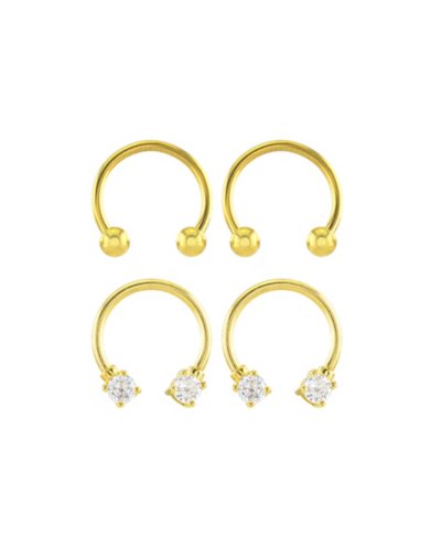 Includes: 4 Horseshoe rings Barbell Material: G23 Titanium Stone Type: Cubic zirconia Gauge: gauge/1.2mm Length: 3/8"/10mm Externally threaded closure Jewelry Care: Clean with antibacterial soap and warm water Piercing Care: Clean withH2Ocean Aftercare Spray(sold separately) or saline solution Imported Note: Do not use any harsh, alcohol-based chemicals as this may cause tarnishing Do not over-thread or apply excess pressure when adding/removing beads as breakage could occur Wear in healed piercings only. If irritation occurs, remove immediately This is a decorative item and should not be worn.