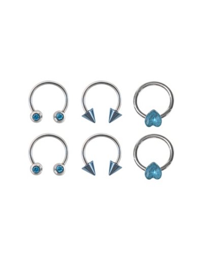 Exclusively at Spencer's Includes: 4 Horseshoes 2 Hoops Piercing Type: Multiple Barbell Material: 316L surgical steel Gauge: gauge/1.2mm Length: 3/8" Stone Type: Cubic zirconia Stone Color: Blue Externally threaded closure Jewelry Care: Clean with antibacterial soap and warm water Piercing Care: Clean withH2Ocean Aftercare Spray(sold separately) or saline solution Imported Note: Do not use any harsh, alcohol-based chemicals as this may cause tarnishing Surgical steel may contain trace amounts of nickel Do not over-thread or apply excess pressure wh.