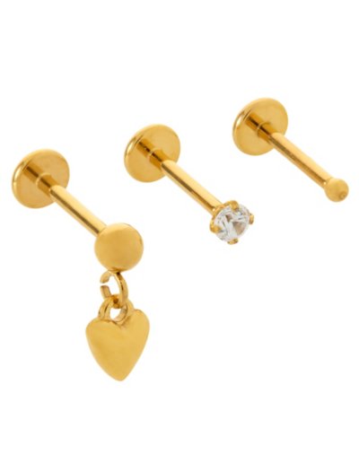 Multi-Pack CZ Goldtone Heart Labret Lip Rings 3 Pack - Gauge