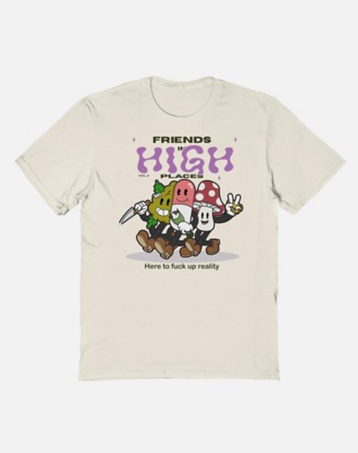 Want to bring the humor with you wherever you go? Wear this Friends in High Places 7Am Creations t shirt and you'll rake in the laughs. Officially licensed Crewneck Short sleeves Material: Cotton Care: Machine wash; tumble dry low Imported This shirt is Unisex Sizing only For a fitted look, order one size smaller than your normal size.