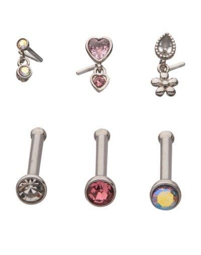 Includes: 3 Nose Pins 3 Nose Bends Piercing Type: Nose Material: 316L Surgical steel Accent Material: Steel Plating Material: Silver Gauge: Gauge/0.8mm Stone Type: Clear, pink, and aurora borealis crystal Jewelry Care: Clean with antibacterial soap and warm water Piercing Care: Clean with H2Ocean Aftercare Spray (sold separately) or saline solution Imported Note: Do not use any harsh, alcohol-based chemicals as this may cause tarnishing Surgical steel may contain trace amounts of nickel Wear in healed piercings only. If irritation occurs, remove immediately. This is a decorative item and should not b.
