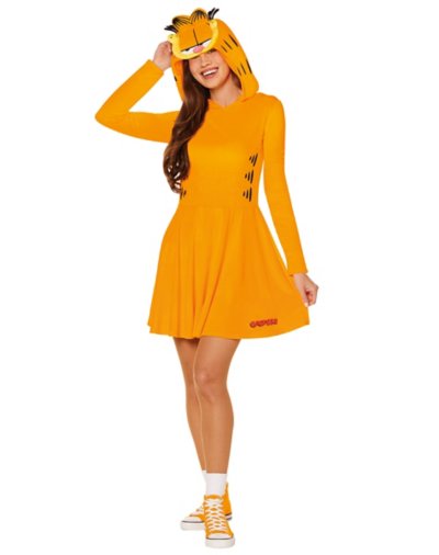 Dress up as your favorite lasagna-loving cat this Halloween when you slip into this officially licensedAdult Garfield Hooded Dress Costume! This costume includes a Garfield dress with an attached hood and tail! Officially licensed Includes: Dress Long sleeves Zipper closure Material: Polyester Care: Spot clean Imported Note: Shoes and socks sold separately.