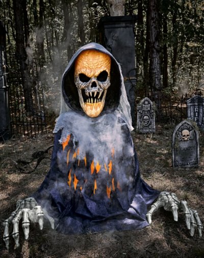 Expelled from the Underworld for a minor infraction, The Demonic Gatekeeper was relegated to guarding Hells Mouth to keep the dead from rising up. Although it was a punishment, keeping demons and the other riffraff from clawing their way back to earth was a very demanding job. As the pressure of this huge responsibility started to get to him, the Gatekeeper became disgruntled, and even more evil. Now, in addition to guarding, if you happen to hear his evil laugh and be in the gaze of his menacing orange glowing eyes, he will rise up and send you down so he can guard you too in your eternal unrest. The last thing you want on Halloween night is a visit from The Demonic Gatekeeper. When activated, this sinister animatronic speaks four diabolical phrases and raises from 3.5 Ft. to 4.7 Ft. Watch as this demons eyes light up with orange LED lights as he laughs evilly at his next victims. And the best part? The Demonic Gatekeeper is comp.