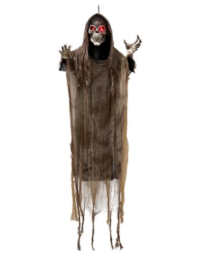 Take your outdoor dcor game to new levels of supernatural thrills when you show off this Light-Up Decaying Reaper Static Prop! One look into this demonic, decrepit figure's glowing red eyes and you'll be scared senseless. Dimensions: 60.2" H x 31.5" W x 4.7" D Battery type: AAA Sound activated Material: Fabric, plastic, electronics Care: Spot clean Imported.