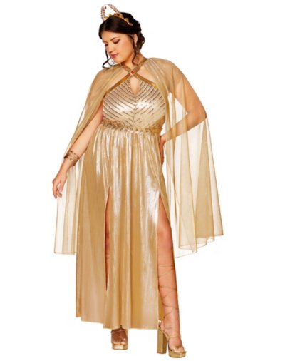 From Our Exclusive Signature Collection. Embrace the divine allure of ancient history with this beautiful Roman Goddess Costume. This set includes a golden dress that features a striped design on the torso and a flowing draped cape detail, capturing the essence of the timeless look. Pair it with the included headband, belt, and pin so you can channel your power and beauty at your next Halloween celebration! Includes: Dress Headband Belt Pin Halter neckline Sleeveless Pullover style Material: Polyester, spandex Care: Spot clean Imported Note: Shoes and jewelry sold separately.