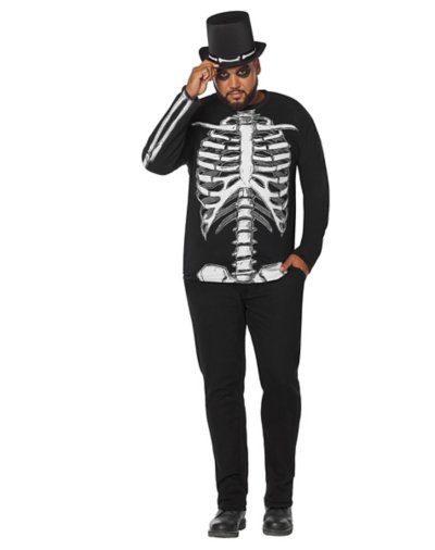 Slip on this skeleton shirt and youll be ready for a night of frightening fun! This black long sleeve tee features skeletal graphics on the front, back, and arms, giving the appearance of a bony bod. Available exclusively at Spirit Halloween, this skeleton tee is the perfect shirt for a spooky night of fright! Exclusively at Spirit Halloween Crewneck Long sleeves Pull over style Length: About 28.5 from shoulder to hem Material: Cotton, polyester Care: Hand wash Imported Regular fit Note: Pants and shoes sold separately.