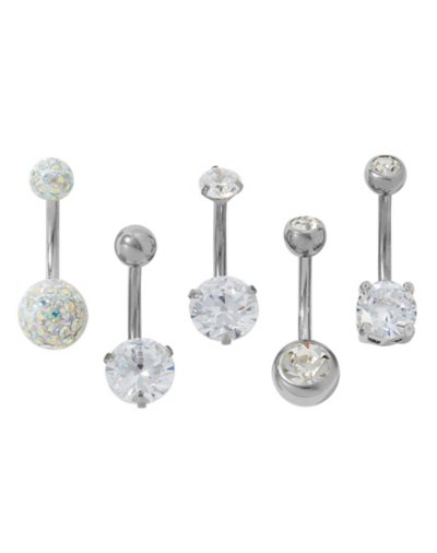 Includes: 5 belly rings Piercing Type: Belly Barbell Material: 316L surgical steel Accent Type: Metal alloy Gauge: gauge/1.6mm Stone Type: Cubic zirconia Ball Size: 5mm Threaded closure Jewelry Care: Clean with antibacterial soap and warm water. Piercing Care:Clean with H2Ocean Aftercare Spray (sold separately) or saline solution. Imported Note: Do not use any harsh, alcohol-based chemicals as this may cause tarnishing. Do not over-thread or apply excess pressure when adding/removing beads as breakage could occur. Surgical steel may contain trace amounts of nickel.