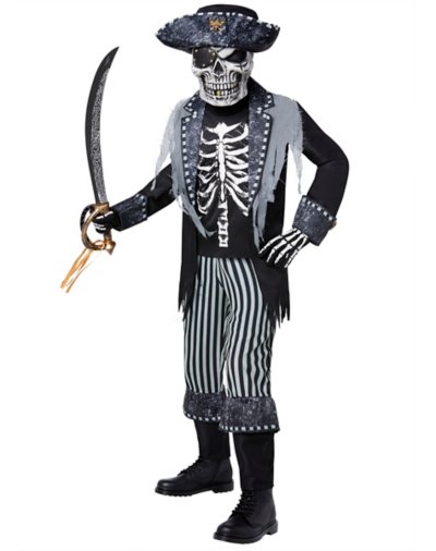 Transform into the deadliest pirate in history and haunt the seven seas when you wear this Kids Skeleton Pirate Costume this Halloween. Featuring a jacket with an attached skeleton shirt, pants, and a skull half mask, you'll be screaming "YO HO!" all Halloween long. Put on the included pirate hat and gloves to complete the look! Includes: Jacket with attached skeleton shirt Pants with atached boot covers Hat Gloves Half mask Long sleeves Velcro closure Material: Polyester, spandex, plastic with ethylene-vinyl acetate Care: Spot clean Imported Note: Weapon and shoes not included.