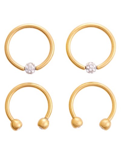 Includes: 2 horseshoe rings 2 captive rings Piercing Type: Multiple Material: 316L Surgical steel Plating Material: Gold Gauge: Gauge/1.5mm Length: 10mm Ball Size: 3mm Threaded closure Jewelry Care: Clean with antibacterial soap and warm water Piercing Care: Clean withH2Ocean Aftercare Spray(sold separately) or saline solution Imported Note: Do not use any harsh, alcohol-based chemicals as this may cause tarnishing Do not over-thread or apply excess pressure when adding/removing beads as breakage could occur Surgical steel may contain trace amounts of nickel Wear in healed pierci.
