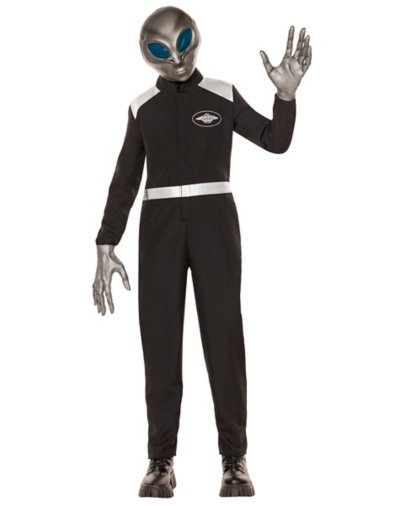 Invade the party in this kids' alien jumpsuit costume! This out-of-this-world costume features a black jumpsuit with an embroidered spacecraft chest emblem and silver shoulder and belt accents. A chilling mask with unnaturally large blue eyes and a pair of oversized hands complete this alien style. Includes: Jumpsuit Mask Gloves Material: Polyester, latex Care: Spot clean Imported Shoes sold separately WARNING: Do not use if allergic to latex.