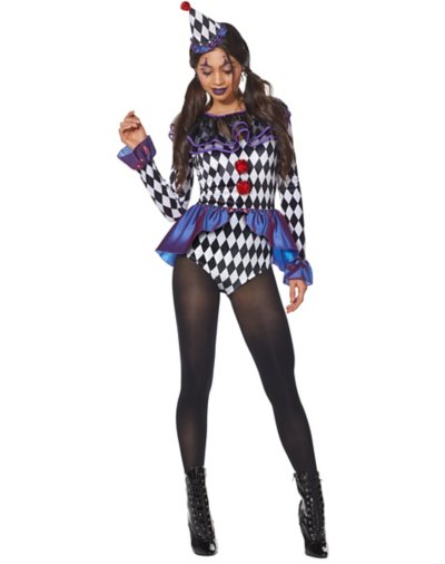 Turn yourself into a circus clown with this adorable black and white diamond-print bodysuit! The ruffle details and included mini hat and stockings will have you ready to perform on Halloween night! You better freshen up those juggling skills because it's your time to shine! Includes: Bodysuit Mini hat Stockings Crewneck Long sleeves Material: Polyester Care: Hand wash Imported Note: Shoes and accessories sold separately.