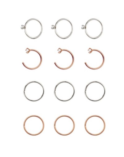 Includes: 9 Nose hoops 3 Nose half hoops Piercing Type: Nostril Barbell Material: 316L Surgical steel Accent Material: 316L Surgical steel Gauge: Gauge/0.8mm Length: 8mm Stone Type: Cubic zirconia Jewelry Care: Clean with antibacterial soap and warm water Piercing Care: Clean withH2Ocean Aftercare Spray(sold separately) or saline solution Imported Note: Do not use any harsh, alcohol-based chemicals as this may cause tarnishing Surgical steel may contain trace amounts of nickel Wear in healed piercings only. If irritation occurs, remove immediately. This is a decorative item and.