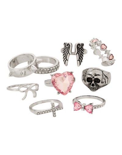 Buy Multi-Pack Pink Angel Skull Heart Rings - 9 Pack for $16.99 at @ Spencersonline.com