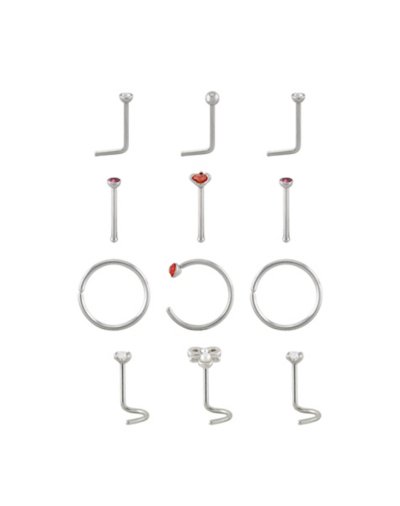 Includes: 3 L-Bends 3 Nose pins 2 Nose hoops 1 Nose half hoop 3 Screw nose rings Piercing Type: Nose Material: 316L surgical steel Gauge: Gauge/0.8mm Stone Type: Cubic zirconia Jewelry Care: Clean with antibacterial soap and warm water Piercing Care:Clean withH2Ocean Aftercare Spray(sold separately) or saline solution Imported Note: Do not use any harsh, alcohol-based chemicals as this may cause tarnishing Wear in healed piercings only. If irritation occurs, remove immediately This is a decorative item and should not be worn to sleep.
