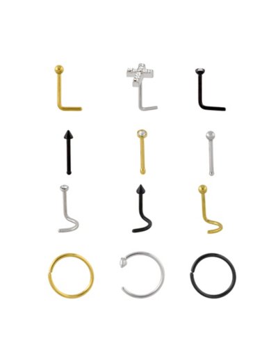 Includes: 3 L-bend nose rings 3 Pin nose rings 3 Corkscrew nose rings 3 Nose hoops Piercing Type: Nose Barbell Material: 316L Surgical steel Gauge: Gauge/0.8mm Stone Type: Cubic zirconia Jewelry Care: Clean with antibacterial soap and water Piercing Care: Clean with H2Ocean Aftercare Spray (sold separately) or saline solution Imported Note: Do not use any harsh, alcohol-based chemicals as this may cause tarnishing Surgical steel may contain trace amounts of nickel.