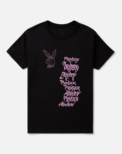 Put a trippy spin on your casual wear with this black Playboy Bunny wavy t shirt! With its pink writing in a variety of pink fonts and styles, this graphic tee is sure to make everyone look twice. Officially licensed Exclusively at Spencer's Crewneck Short sleeves Material: Cotton Care: Machine wash; tumble dry low Imported This shirt is Unisex Sizing only For a fitted look, order one size smaller than your normal size.