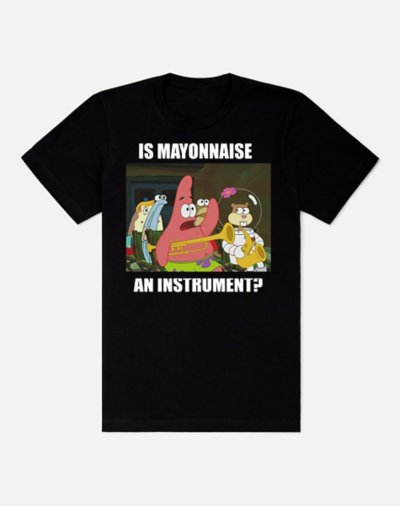 "No Patrick, Mayonnaise is not an instrument." Relive one of your favorite classic Spongebob moments with this hilarious Is Mayonnaise an Instrument T Shirt. Officially licensed Exclusively at Spencer's Crewneck Short sleeves Material: Cotton Care: Machine wash; tumble dry low Imported This shirt is Unisex Sizing only For a fitted look, order one size smaller than your normal size Note: This item is print to order and may have a 1-2 day extra processing time.