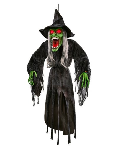 Searching for the perfect decoration to freak out your friends? Look no further than this 4 Ft Hanging Green Wicked Witch. This motion-activated decoration features four spooky sound effects that'll make your guests scream bloody murder! Motion activated Battery Type: 3 AA batteries (included) Dimensions: 11.8" H x 9" W x 12.8" D Material: Plastic, fabric, electronics Care: Spot clean Imported Recommended for use in covered areas.