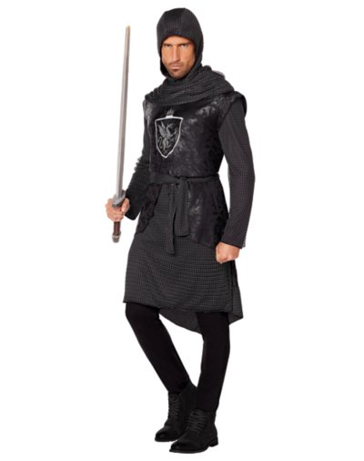 Hear ye, hear ye! Prove your honor and loyalty to the king this Halloween when you defend the castle dressed up in this Noble Knight Costume. Featuring a black tunic, hood and belt, this awesome medieval style costume will have you looking just like a brave knight from the medieval era and will have you looking great at any costume party. Includes: Tunic Hood Belt Long sleeves Velcro closure Material: Polyester, nylon Care: Spot clean Imported.