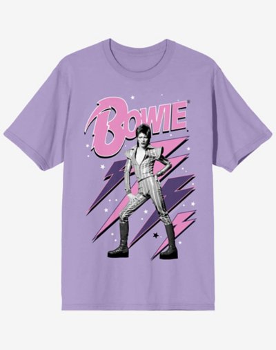 Channel your inner glam rocker with this officially licensed Purple Ziggy Stardust T Shirt! Complete with a graphic of Bowie's iconic striped jumpsuit and lightning bolt design, this t shirt is a must-have for lovers of all things David Bowie. Suit up in this stylish tee and you'll always be showing your fandom. Officially licensed Exclusively at Spencer's Crew neck Short sleeves Material: Cotton Care: Machine wash; tumble dry low Imported This tee is Unisex Sizing only For a fitted look, order one size smaller than your regular size.