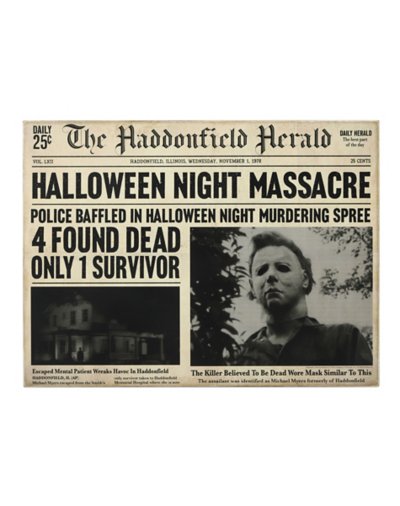 Decorate your home with a piece of Halloween history with this officially licensed Michael Myers Haddonfield Herald Sign. This snippet of whats dubbed the Halloween Night Massacre shows an image of Michael Myers next to the headline that reads 4 Dead Only 1 Survivor. If youre a fan of the Halloween movies, this sign is a super cool tribute to the events of the film and will look great as a decoration. Exclusively at Spirit Halloween Officially licensed Dimensions: 12"H x 16"W Materials: Medium density fibreboard, Paper, Metal Imported.