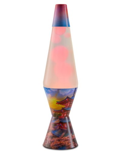 Turn your home decor from boring to amazing in seconds with this beautiful Peach Sunset Pagoda Lava Lamp. Adorned with a cherry blossom and pagoda design there's no doubt this stylish lava lamp will have your room looking groovy! You'll be amazed as the peach colored wax inside flows, collides, and splits apart as it oozes its way up and around the clear glass globe. Includes: Globe Base and cap 25w bulb Dimensions: 14.5" H x 3.9" W x 3.9" D Capacity: oz. Material: Metal, glass, package Cord Length: 5 feet For indoor use Care: Operate and store away from direct sunlight. Wait 2-4 hours for lamp to reach maximum flow and experience. Imported Note: To clear up the water, let the wax settle at the bottom of the globe and completely co.