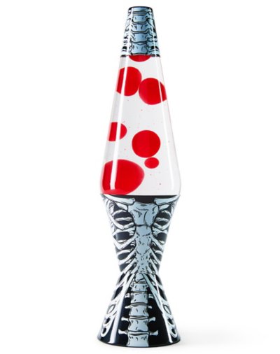 Looking to add some killer style to your favorite room? Get ready to glow with the flow when you get this Black and White Ribcage Lava Lamp. This 17 inch lamp has red wax, clear liquid, and a terrifying design that'll perfectly match your style. Includes: Globe Base and cap 40w bulb Dimensions: 17" H x 4.5" W x 4.5" D Capacity: oz. Material: Glass, metal, plastic Cord Length: 6 feet Care: Operate and store away from direct sunlight. Wait 2-4 hours for lamp to reach maximum flow and experience. Imported Note: To clear up the water, let the wax settle at the bottom of the globe and completely cool. Then, turn on until wax breaks up. After breaking begins, shut off again until it cool, then repeat. Running the lamp in short "bursts" will help. To.