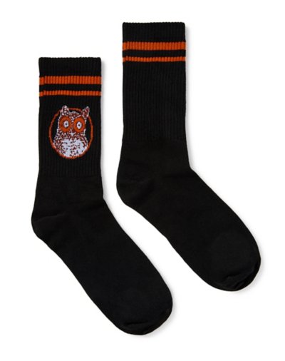 Show off your fave restaurant with these fun black Hooters crew socks! With the Hooters owl and stripes at the top, these socks are the perfect addition to any outfit. Officially licensed Exclusively at Spencer's Material: Polyester, spandex Care: Machine wash Imported.