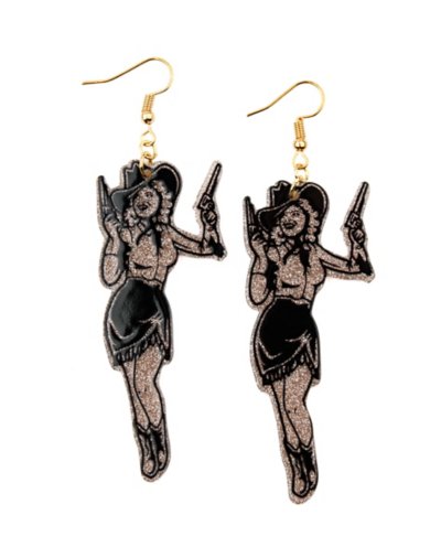 Buy Cowgirl with Pistol Glitter Dangle Earrings for $12.99 at @ Spencersonline.com