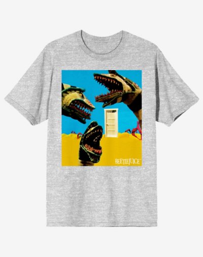 Enter the afterlife with this officially licensedSandworm Dimension Door T Shirt from the one and only Beetlejuice. This grey tee is perfect for any fan of this cult-classic film! Officially licensed Exclusively at Spencer's Crewneck Short sleeves Material: Cotton Care: Machine wash; tumble dry low Imported This shirt is Unisex Sizing only For a fitted look, order one size smaller than your normal size Note: This item is print to order and may have a 1-2 day extra processing time.