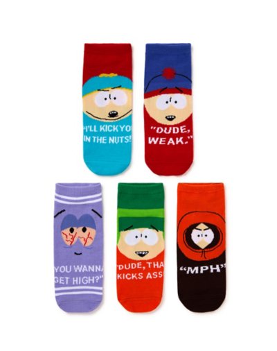 "Dude, that kicks ass." Make getting dressed a breeze with this 5-pack of no-show South Park socks. Featuring funny quotes and bold graphics, these South Park socks are top drawer material. Officially licenesd Includes: 5 Pairs of socks Material: Polyester Care: Machine wash Imported.