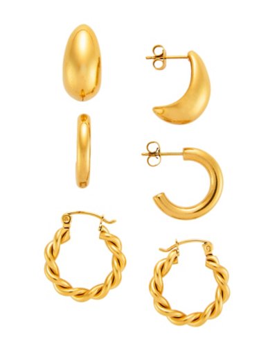 Includes: 3 Pairs of hoop earrings Material: 316L Surgical steel Plating Material: Gold Jewelry Care: Wipe clean orSpencer's Jewelry Wipes Imported Note: Do not use any harsh, alcohol-based chemicals as this may cause tarnishing Surgical steel may contain traces of nickel This is a decorative item and should not be worn to sleep.