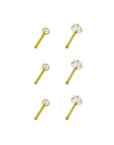 Includes: 6 Nose pins Piercing Type: Nose Material: 316L surgical steel Gold Plated Gauge: G/0.8mm Length: 5/16" Stone Type: Cubic zirconia Jewelry Care: Clean with antibacterial soap and warm water Piercing Care: Clean withH2Ocean Aftercare Spray(sold separately) or saline solution Imported Note: Do not use any harsh, alcohol-based chemicals as this may cause tarnishing Surgical steel may contain trace amounts of nickel Wear in healed piercings only. If irritation occurs, remove immediately. This is a d.