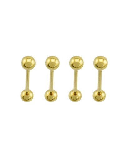 Includes: 4 Barbells Piercing Type: Multiple Barbell Material: 316L Surgical steel Plating Material: Gold plated Gauge: Gauge/1.6mm Length: 5/8"/16mm Ball Size: 5mm Externally threaded closure Jewelry Care: Clean with antibacterial soap and warm water Piercing Care: Clean with H2Ocean Aftercare Spray (sold separately) or saline solution Imported Note: Do not use rubbing alcohol to clean jewelry. Normal alcohol consumption and/or mouthwash may accelerate wear and tear Do not over-thread or apply excess pressure when adding/removing beads as breakage could occur Wear in healed piercings only. If irritation occurs, remove immediately.