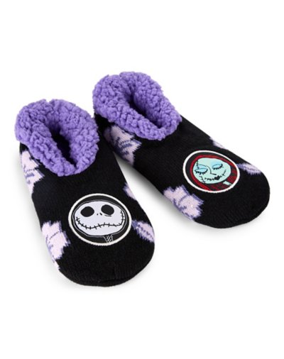 Cozy is a guaranteewhen you slip into these officially licensed Jack and Sally Slippers! These fun fuzzies will be the perfect addition to any The Nightmare Before Christmas fan's closet. This pair of slippers features a fuzzy purple fleece, and charming portraits of your favorite pumpkin king and queen! Officially licensed Material: Polyester Care: Hand wash Imported.