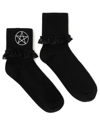Add some edgy vibes to your sock game with these Pentagram Frill Quarter Crew Socks. This pair of socks are the perfect choice for showing off a little bit of your dark side. Exclusively at Spencer's Material: Polyester Care: Machine wash Imported.
