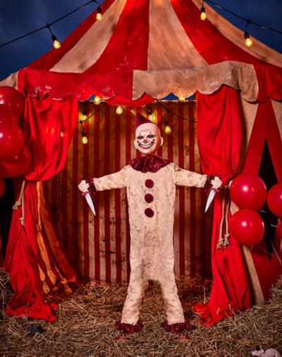 Some kids are just born nasty. Dagger Mike never was a normal kid. He liked rats, bugs, knives, creepy clowns, and scaring the heck out of everyone in the neighborhood. Then, when he turned nine, he started to get creative, employing elaborate traps to trick the local kids and send them running home. However, the locals caught on quickly and tried to put an end to Mike's games. So instead, he opted for something simpler a cute clown outfit and two little daggers. Now there are no more tricks. So when you see Mike, you'd better steer clear or be ready for your final surprise. Dagger Mike may seem small and innocent at first at 3 ft 11 inches but get too close and hell pop up and extend up to 4 ft 9 inches tall taking all your guests by surprise! Youll know once hes about to strike once you see his head tilt upward as his body prepares to pop up for a fright! Includes: Animatronic.